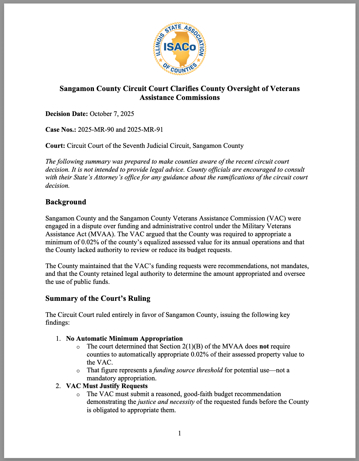A recent Sangamon County Circuit Court decision portends to clarify the relationship between county boards and Veterans Assistance Commissions (VACs) under the Military Veterans Assistance Act (MVAA).