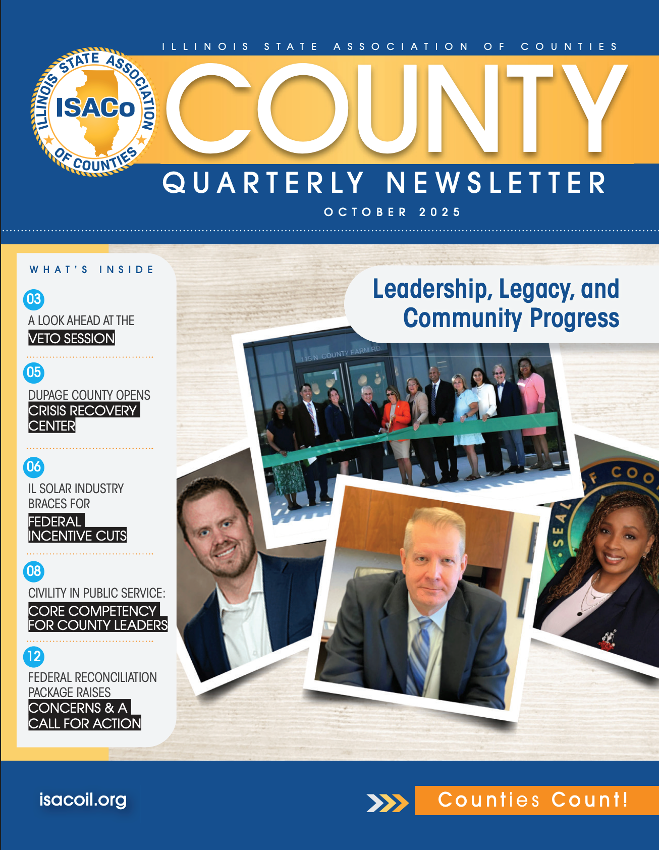The October County Quarterly includes an Executive Director's Report, includes a look ahead at the 2025 Veto Session, welcomes new board members to the ISACo Board of Directors, reports on DuPage County opening a crisis recovery center, includes information on the Illinois Solar Industry, celebrates America's 250th Anniversary, discusses civility in public service, congratulates McHenry County Administrator, Peter Austin, for his retirement, includes information about the newly passed federal reconciliation package and its impact on counties, and shares ISACo's Corporate Sponsors and their services.