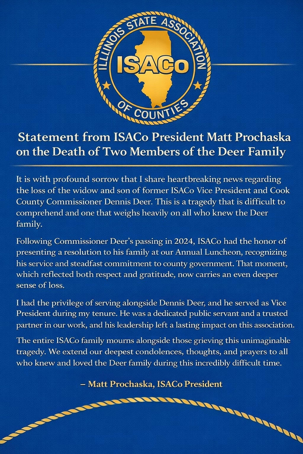 ISACo President Matt Prochaska's Statement on the Deer Family
