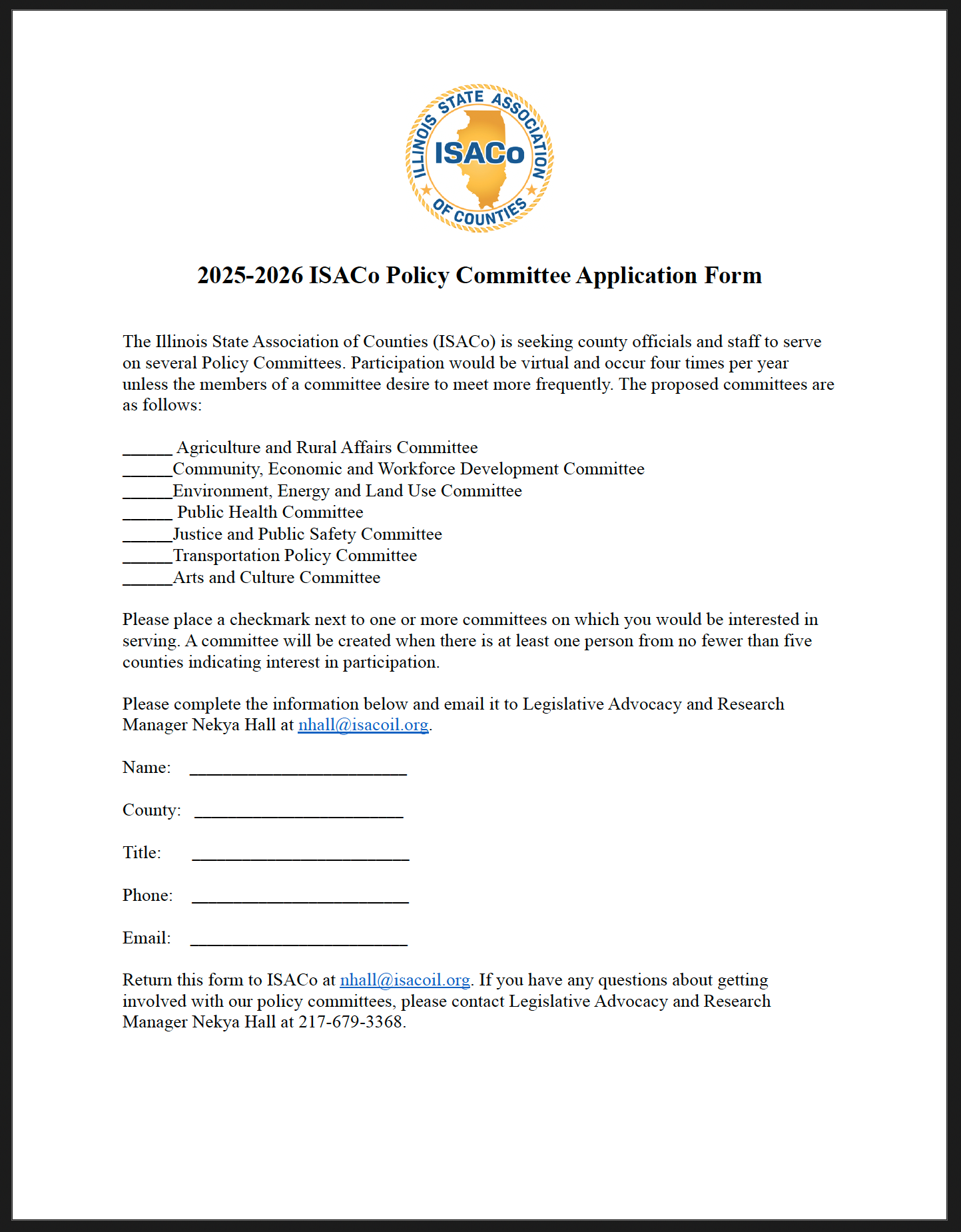Please click on the image below, complete the form and e-mail it to Legislative Advocacy and Research Manager Nekya Hall at nhall@isacoil.org.